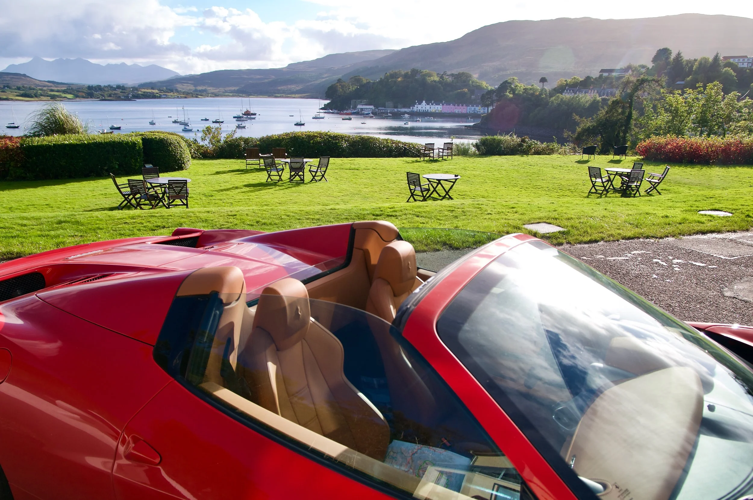 Sind Sie jedoch neugierig oder Ihre Liebe zum Norden hat schon einen festen Platz in Ihrer Seele, dann denken Sie unbedingt einmal über Schottland als Sportwagentour im April 2026 nach. Wir jedenfalls lieben dieses Land. Und die Leute hier oben auf der Britischen Insel. Wir lieben das Land und die Menschen der Clans, Kilts und Tartanmuster, der Highland Games und des Dudelsacks. Während unseres Roadmovies erfahren Sie Schottlands Highlands, den weiten Norden und das Juwel der Schottischen Inseln: Skye! Die zauberhafte Magie dieser Weltgegend beeindruckt vor allem auf den einsamen Strecken durch die atemberaubende Kargheit von Moor, Fels und Heide. Und gleichzeitig: jeder noch so abgelegene Winkel Schottlands ist getränkt von Geschichte. Hier kämpften die Clankrieger gegen die englische Übermacht, da entfloh Maria Stuart ihren Wärtern und dort liegt das Herz des großen Bruce begraben. Dazu reichlich Filmkulissen: Highlander, Rob Roy, Braveheart & James Bond lassen grüßen. Im Bild allerdings ein Ausschnitt vom hier beworbenen “ROADMOVIE” am Loch Maree im herb schönen Westerross. Traumhaft gewundene Strecken, einsam, aufregend weil wellig und mit blind summits und hidden dips versehen. Sie fahren also gelegentlich auf kleine Kuppen zu und wissen nicht, wie es dahinter weitergeht. Nur eines ist sicher: kurvig!